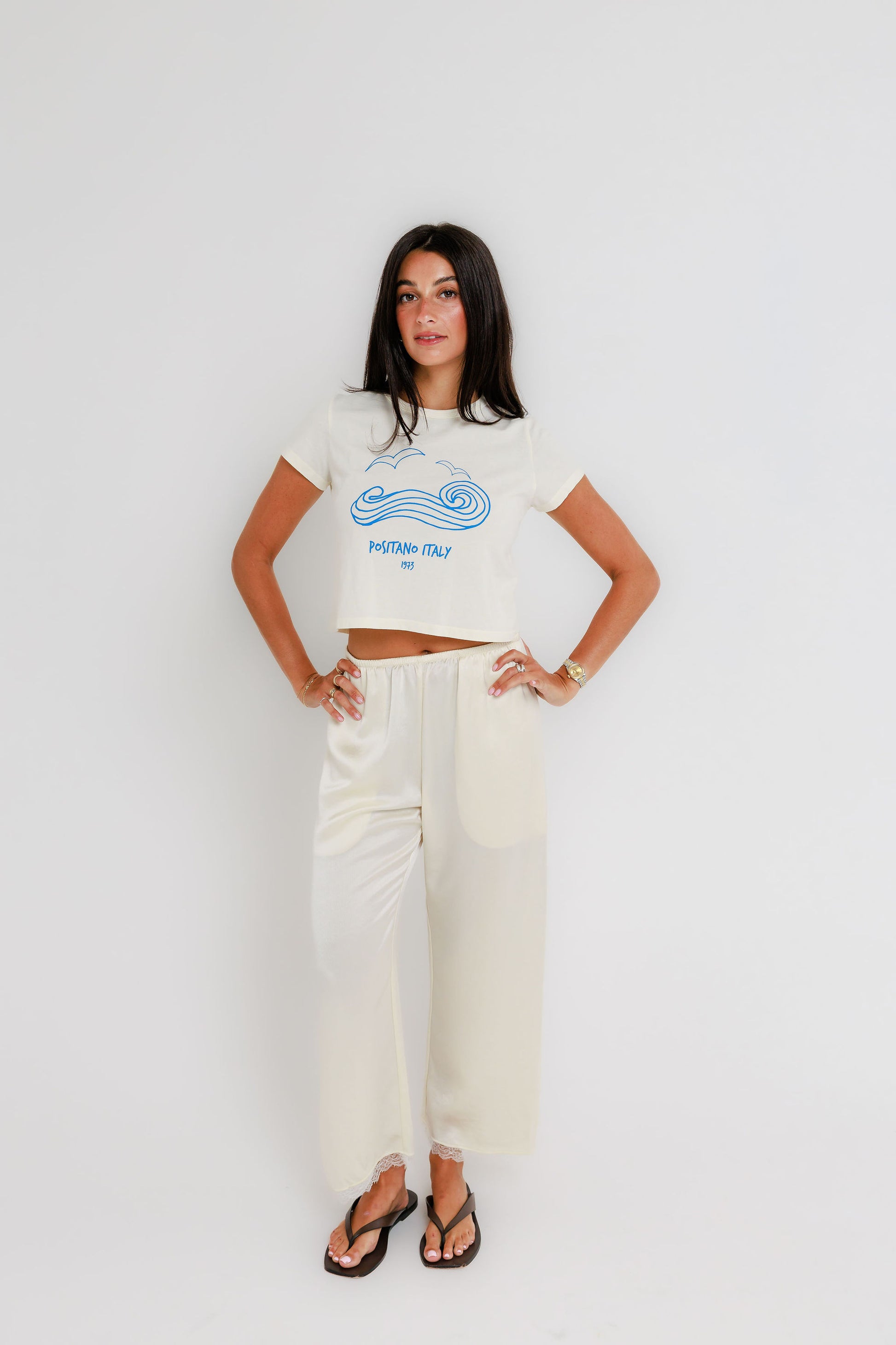 The Positano Tiny Tee is bright, breezy, and postcard perfect. It carries that colorful cliffside charm in a flattering tiny tee shape. It’s an effortless statement piece that feels like summer on repeat.